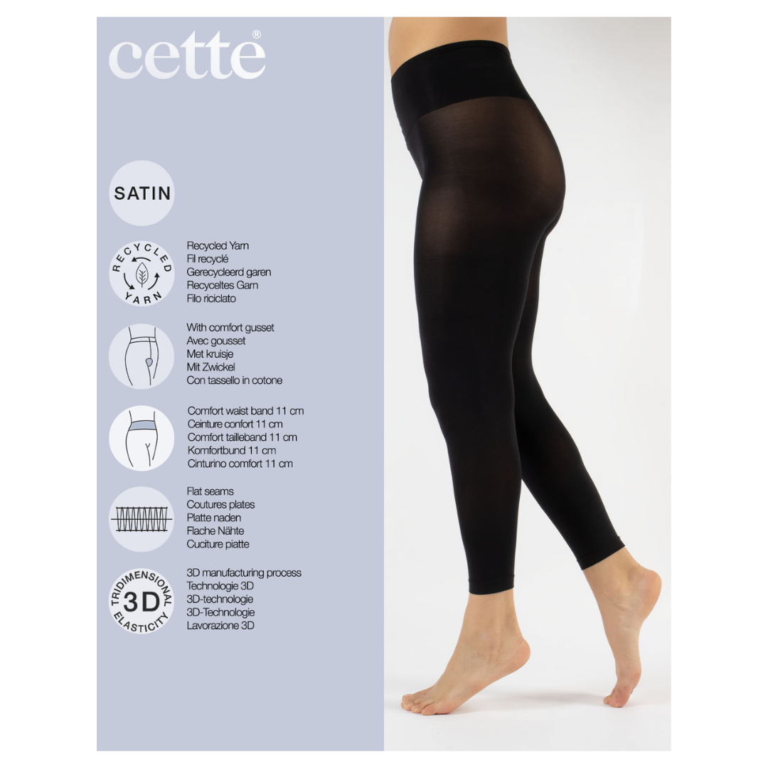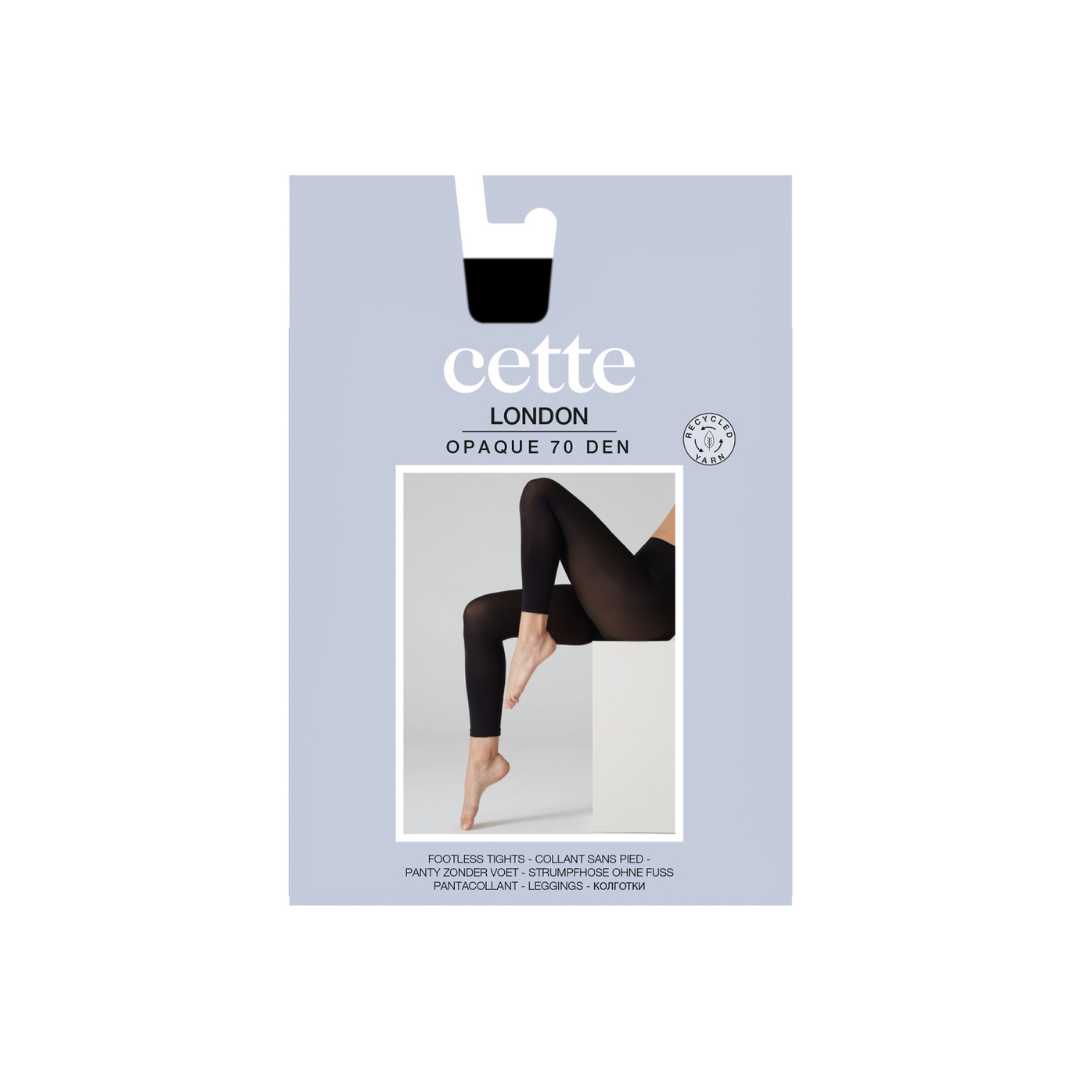 London Leggings i 70 denier er komfortable strømpebukser, lavet af genanvendt polyamid, elastan og bomuld. De er fodløse og let gennemsigtige, så de passer perfekt under kjoler, nederdele eller som lag-på-lag om vinteren både for kvinder og mænd.