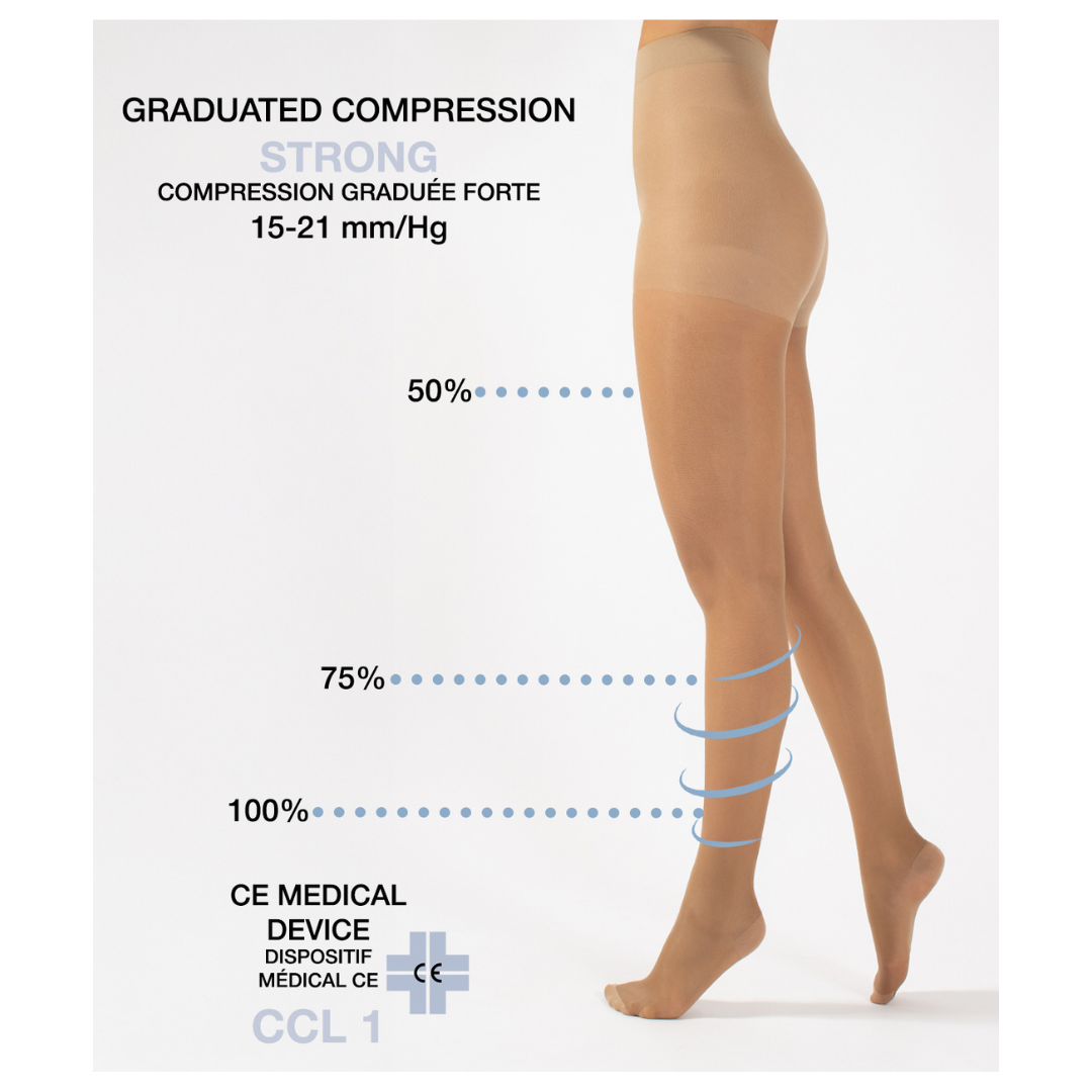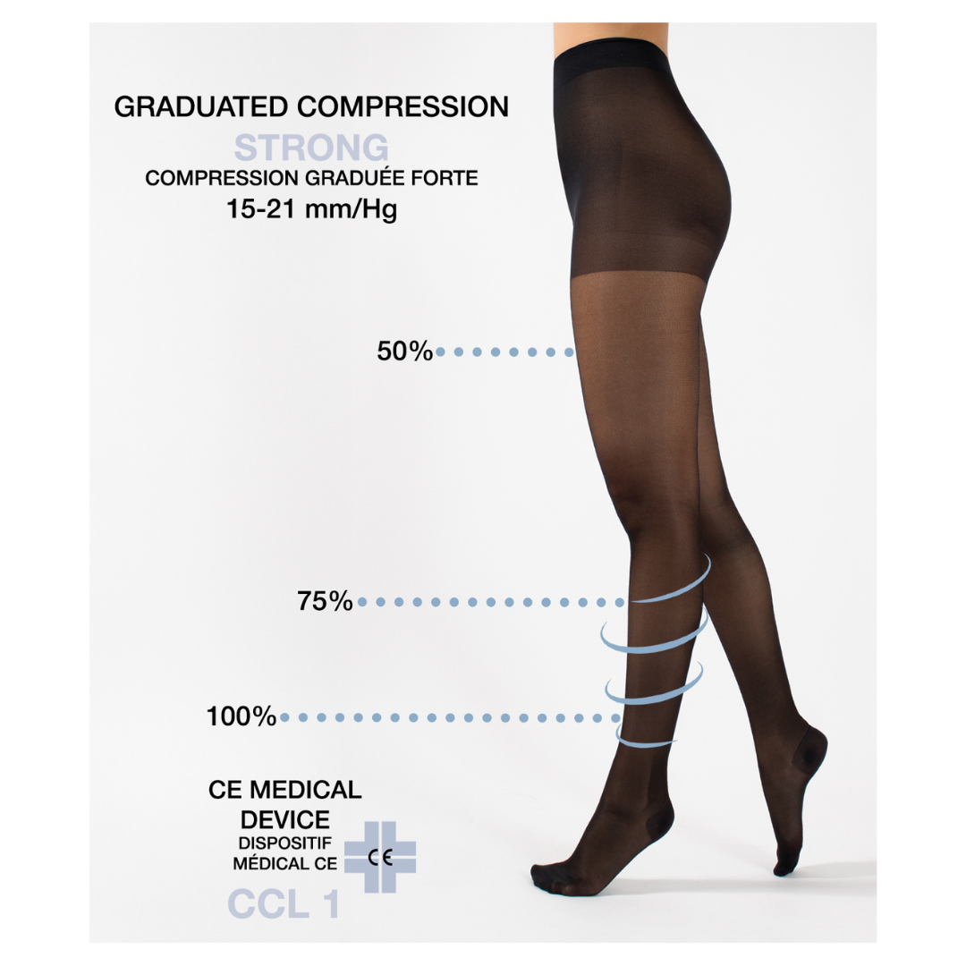 Strømpebukserne har en gradueret kompression på 15–21 mmHg, som starter ved anklen og gradvist aftager op ad benet. Denne type kompression kan være en hjælp til at støtte blodcirkulationen og kan give lindring ved trætte, tunge eller hævede ben. De egner sig derfor godt til lange arbejdsdage på benene – eksempelvis for sygeplejersker og andre med stående arbejde – samt til længere rejser eller flyture.