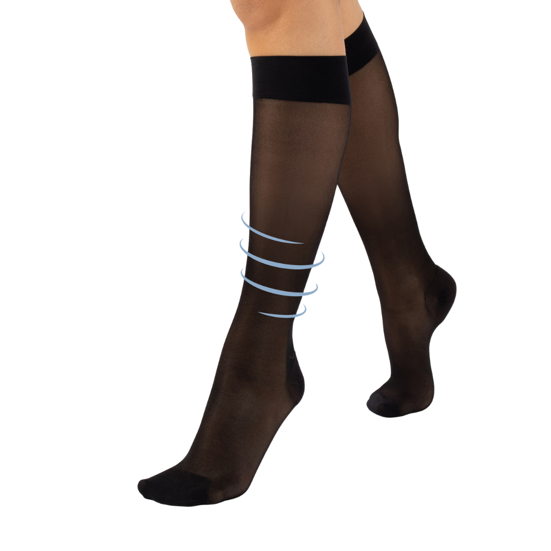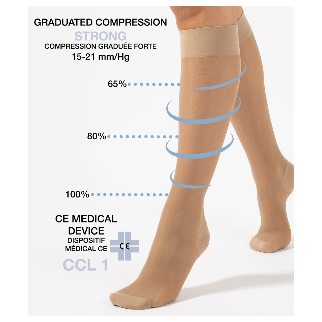 Unisex knæhøje kompressionsstrømper i 140 denier med let og diskret micronet-struktur, som giver et elegant og transparent udtryk. Strømperne er fremstillet af kvalitetsgarn og har en gradueret kompression på 15–21 mmHg, der støtter blodcirkulationen fra anklen og op mod læggen.