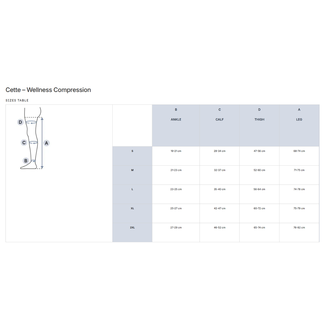 Strømperne har gradueret kompression på 10–14 mmHg, som starter ved anklen og gradvist aftager op mod læggen. Denne kompression hjælper med at støtte blodcirkulationen og kan give lindring ved trætte, tunge eller hævede ben. De er derfor velegnede til personer, der står eller går meget i løbet af dagen, eksempelvis i sundhedssektoren, samt til lange rejser og flyture.